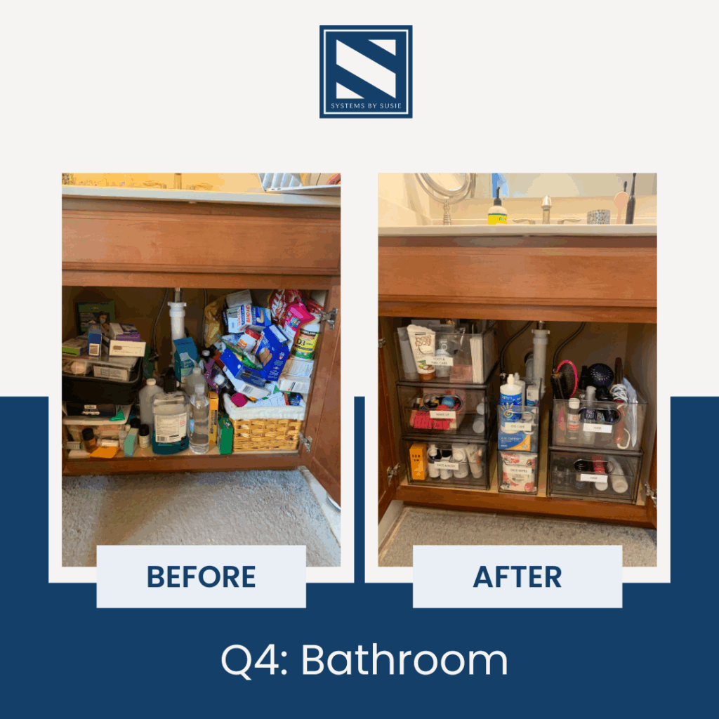 The final space was the primary bathroom. We simplified products, created clean countertop zones and added smart under sink storage. What once felt cluttered and chaotic became a peaceful start and end to the day.